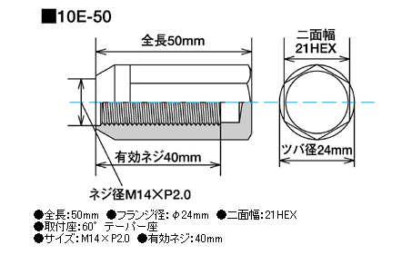 ■ツバ付きロングホイールナット/全長50mm/バラ売り■Fordリンカーンナビゲーター・エクスペディション('00〜)・エクスカージョン('00〜02)/M14×P2.0/21HEX/メッキ■フランジロングナット【10E-50】